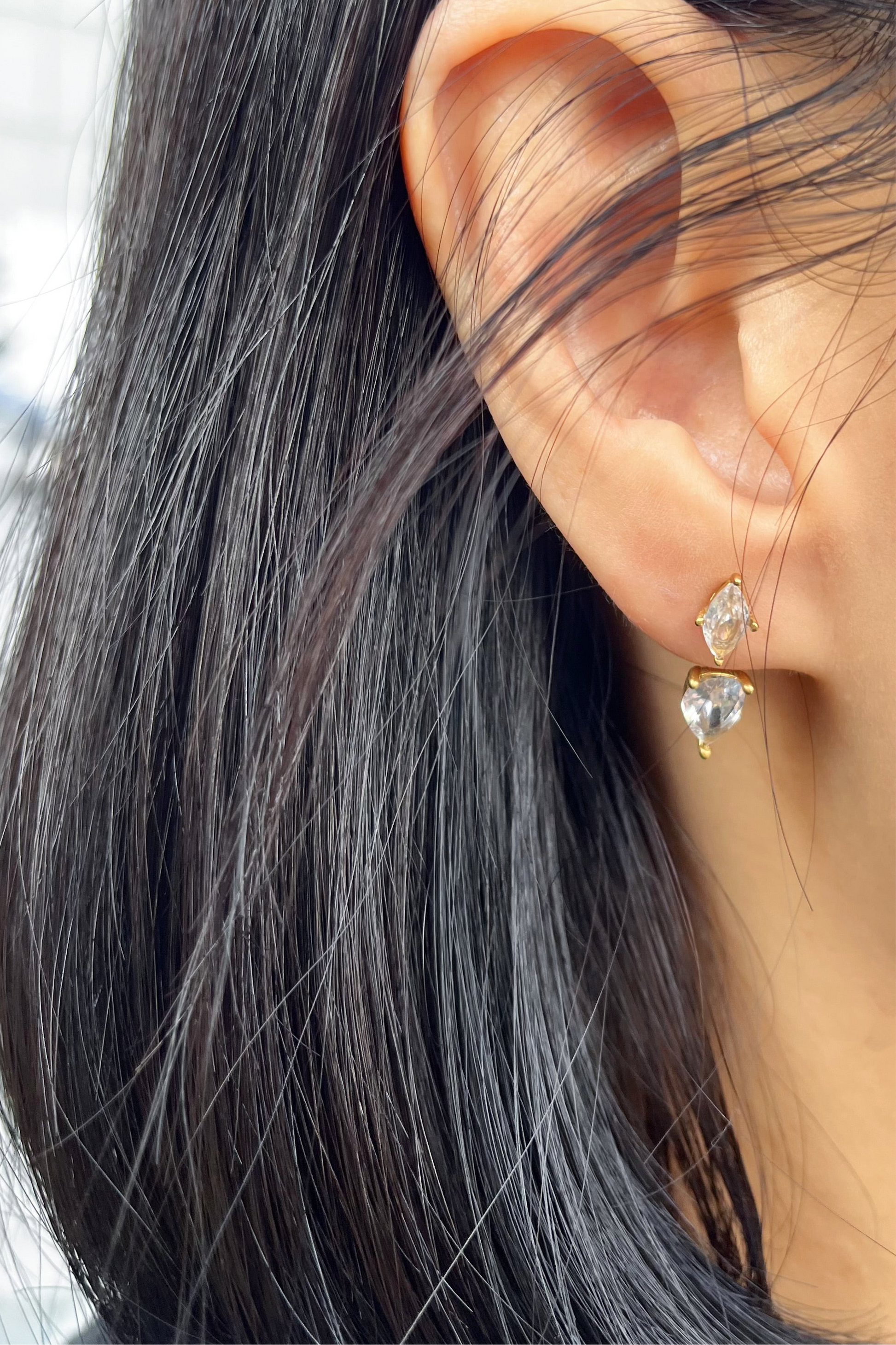 These are luxurious earrings with delicately that shine in gold. Despite their small size, the cubic catch the eye and sparkle elegantly with every movement, creating a subtle sense of luxury and a feminine atmosphere. They are lightweight for comfortable wear, making them suitable for both everyday looks and special occasions. Worn alone, they serve as an elegant statement piece, expressing a stylish and sophisticated charm.