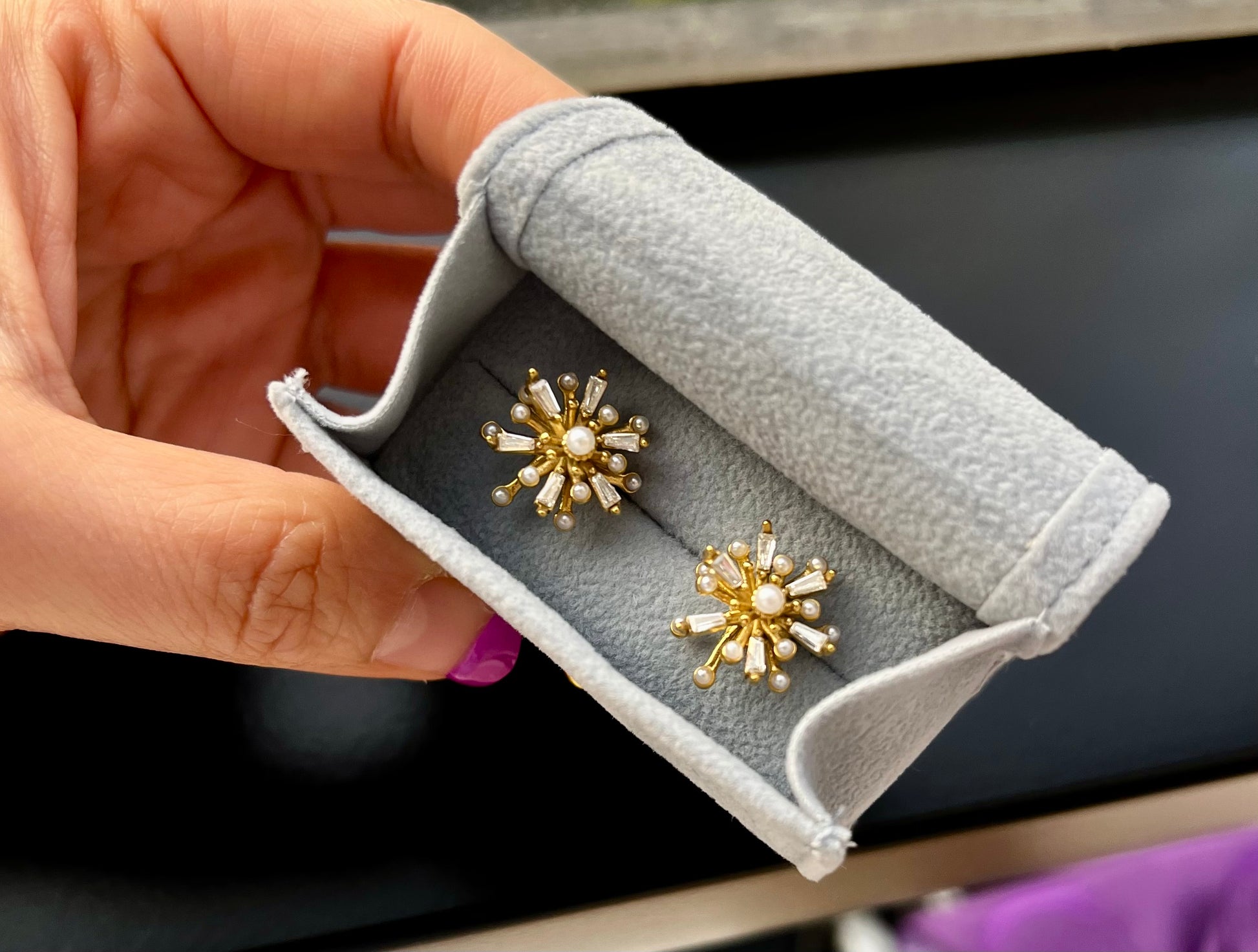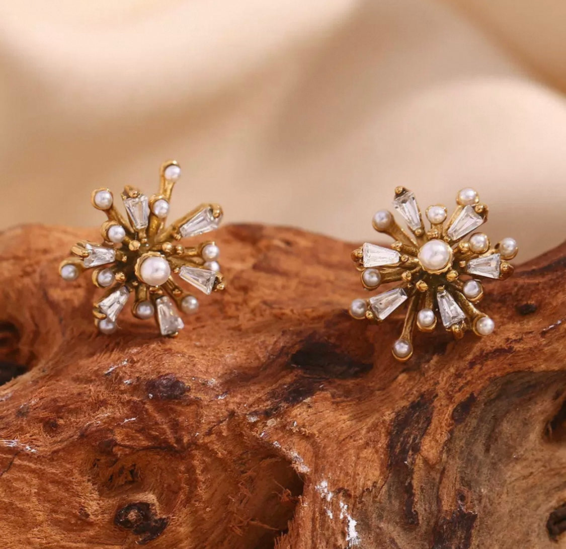 Discover the perfect blend of sophistication and charm with these exquisite earrings. Designed to dazzle, they feature a beautiful arrangement of pearls and sparkling accents that catch the light with every movement. Lightweight and comfortable, these earrings are ideal for both everyday wear and special occasions.